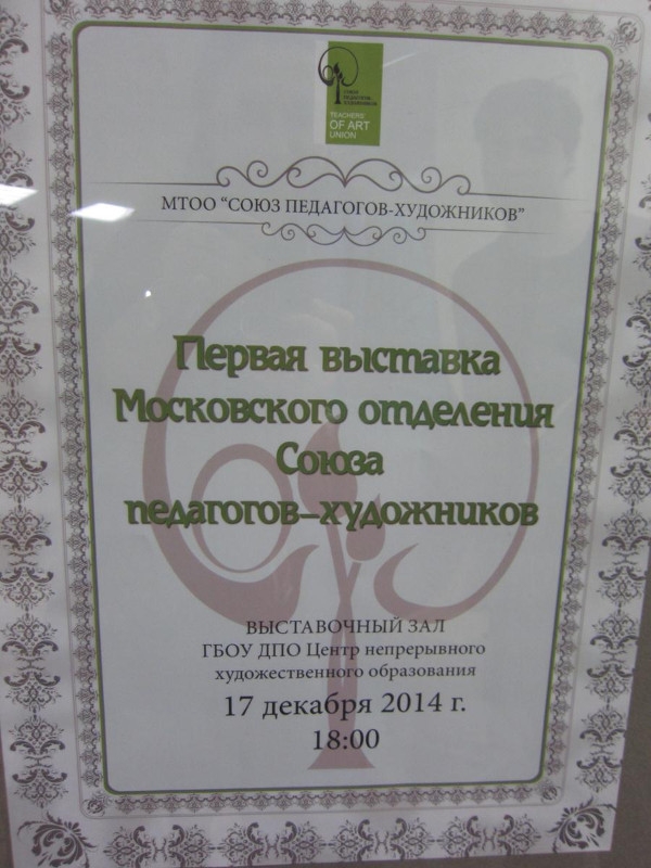 17 декабря 2014 г. в Центре непрерывного художественного образования состоялось открытие первой выставки Московского отделения Союза педагогов-художников. Место проведения выставки выбрано не случайно, выставочный зал Центра является одним из самых посещаемых педагогами-художниками залов Москвы.