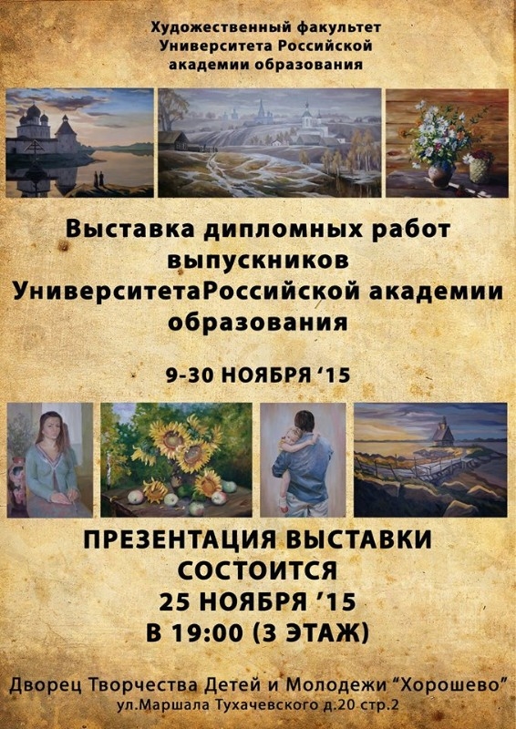 25 ноября 2015 года в ДТДМ "Хорошево" г. Москвы открылась выставка дипломных работ молодых педагогов художников изобразительного искусства и выпускников Университета Российской Академии Образования. В выставке приняли участие выпускники Университета РАО и педагоги Творческой школы-студии изобразительного и декоративно-прикладного искусства ДТДМ "Хорошево" Мазурик Е.К. и Чернышева С.М.