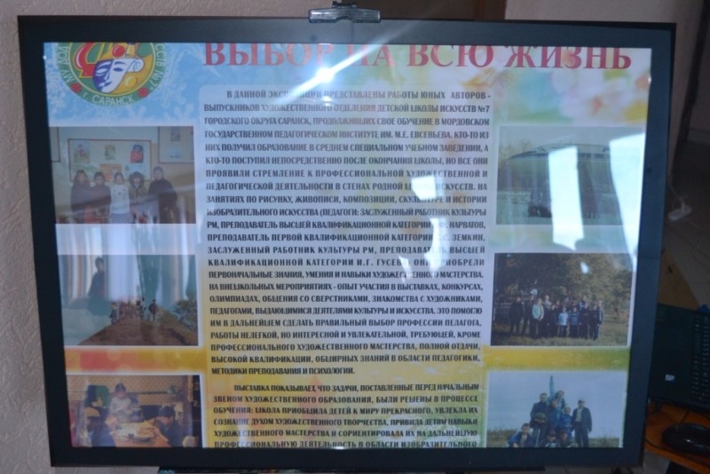 21 января 2016 г. в 14.30 в Выставочном зале Мордовского государственного педагогического института имени М.Е. Евсевьева откроется выставка работ выпускников художественного отделения Детской школы искусств № 7 городского округа Саранск, продолживших свое обучение в Мордовском государственном педагогическом институте им. М.Е. Евсевьева на разных факультетах, в том числе и на факультете педагогического и художественного образования по профилю «Изобразительное искусство». С приветственным словом к собравшимся обратился В. А. Варданян, заведующий кафедрой художественного образования, который представил идейных вдохновителей выставки – Нарватова В. Ф. и Земкина С. С., преподавателей живописи школы искусств № 7. Василий Филиппович и Сергей Сергеевич вспомнили те времена, когда сегодняшние студенты были школьниками и начинали постигать азы живописи. Среди гостей, пришедших на выставку, были Беломоева О. Г., доктор культурологии, профессор, заведующая кафедрой традиционной мордовской культуры и современного искусства Института национальной культуры; Табакова Н. Ф., доцент кафедры традиционной мордовской культуры и современного искусства; преподаватели и учащиеся школ искусств, студенты. Тёплые слова в адрес своей alma mater говорили выпускники школы, а теперь студенты института, преподаватели, школьные учителя. На выставке представлены 25 работ 19 учеников Детской школы искусств, из которых 7 человек в настоящее время являются студентами, а 6 человек закончили обучение на факультете педагогического и художественного образования (профиль Изобразительное искусство). На занятиях по рисунку, живописи, композиции, скульптуре и истории изобразительного искусства (педагоги – заслуженный работник культуры РМ, преподаватель высшей квалификационной категории В. Ф. Нарватов, преподаватель первой квалификационной категории С. С. Земкин, заслуженный работник культуры РМ, преподаватель высшей квалификационной категории И. Г. Гусева) они приобрели первоначальные знания, умения и навыки художественного мастерства. На внешкольных мероприятиях – опыт участия в выставках, конкурсах, олимпиадах, общения со сверстниками, знакомства с художниками, педагогами, выдающимисядеятелями культуры и искусства. Это помогло им в дальнейшем сделать правильный выбор профессии педагога, работы нелегкой, но интересной и увлекательной, требующей, кроме профессионального художественного мастерства, полной отдачи, высокой квалификации, обширных знаний в области педагогики, методики преподавания и психологии. Некоторые выпускники достигли определенных успехов в профессиональной деятельности: Салаева Татьяна Александровна работает ассистентом на кафедре художественного образования и скоро выйдет на защиту кандидатской диссертации, Другова (Исаева) Елена является автором логотипа нашего института, работает в рекламном агентстве. Выставка показывает, что задачи, поставленные перед начальным звеном художественного образования, были решены в процессе обучения: школа приобщила детей к миру прекрасного, увлекла их сознание духом художественного творчества, привила детям навыки художественного мастерства и сориентировала их на дальнейшую профессиональную деятельность в области изобразительного искусства. Они действительно сделали выбор на всю жизн