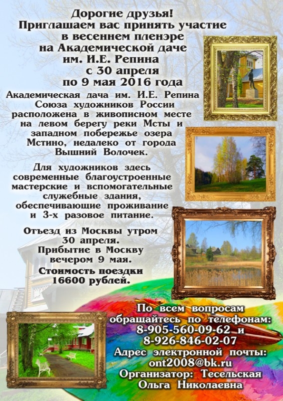 Академическая дача им. И.Е. Репина обеспечивает проживание и 3-х разовое питание. Отъезд из Москвы утром 30 апреля.