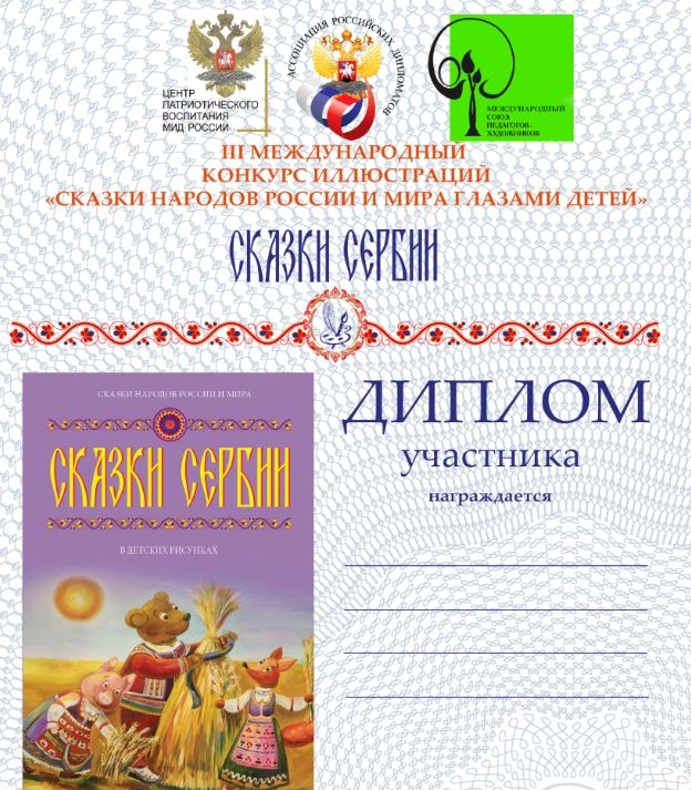 Мы сделали специальную рассылку заверенных дипломов УЧАСТНИКОВ конкурсов (СКАЗКИ СЕРБИИ, ЧЕРЕЗ ИСКУССТВО - К ЖИЗНИ, Я ВИЖУ МИР, МОРЕ И ДЕТИ). В этом году в галереи Союза было принято более 12000 работ! Для того, чтобы дети оперативно получили подтверждение участия, было принято решение о том, что заверенные макеты дипломов родители и педагоги заполнят сами. При этом дипломы считаются действительными только при опубликованной работе в галерее соответствующего конкурса. Макеты были разосланы только по адресам, указанным в заявках при отправке работ на конкурс. Обращаем ваше внимание на то, что дипломы лауреатов и победителей конкурсов будут разосланы организаторами отдельно, в индивидуальном порядке!