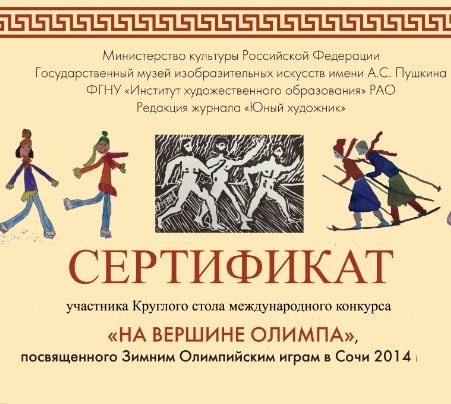 Круглый стол посвящен обсуждению итогов международного конкурса детского рисунка «На вершине Олимпа», посвященного ХХII зимним Олимпийским и ХIПаралимпийским играм в Сочи. Проведение конкурса показало интерес детей и подростков к основным темам, заявленным в условиях конкурса: в большинстве своем они не только любят смотреть спортивные соревнования, но и участвовать, и изображать их. Проблемой для многих оказывается изображение человека в движении.