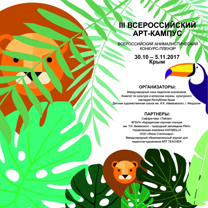 Приглашаем Вас принять участие в самом большом творческом приключении осенних каникул – III Всероссийском арт-кампусе! Проект состоится с 30 октября по 5 ноября 2017 г., а его целью станет проведение Всероссийского анималистического конкурса-пленэра (для педагогов и их учеников, в номинациях «Живопись» и «Графика»). Конкурс пройдёт в единственном в Европе парке львов «Тайган» – здесь художники получат уникальную возможность понаблюдать за повадками и привычками животных в дикой природе! Кроме того, в рамках проекта педагоги смогут принять участие в стажировке Международной программы INTERNATIONAL TRAINING FOR TEACHERS-ARTISTS AND STUDENTS (тема стажировки: «Освоение инновационных художественных материалов»), организованной Международным союзом педагогов-художников совместно с мировым лидером арт-индустрии FILA GROUP (бренды MAIMERI, GIOTTO (Италия), LYRA (Германия), DALER ROWNEY (Великобритания)).