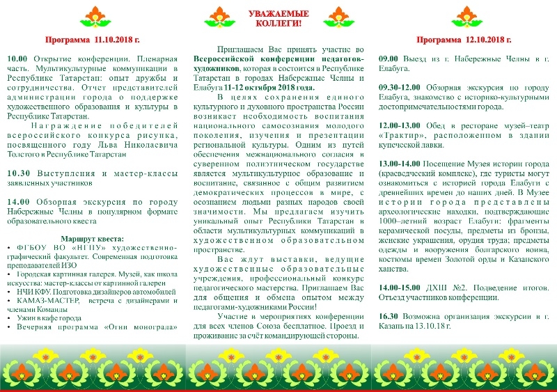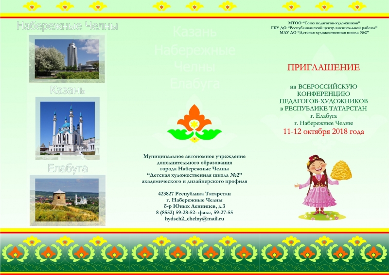 11-12 октября 2018 года состоится Всероссийская конференция педагогов-художников в Республике Татарстан по адресу г. Набережные Челны, бульвар Юных Ленинцев, дом 3 (27/21), МАУДО «Детская художественная школа №2».
