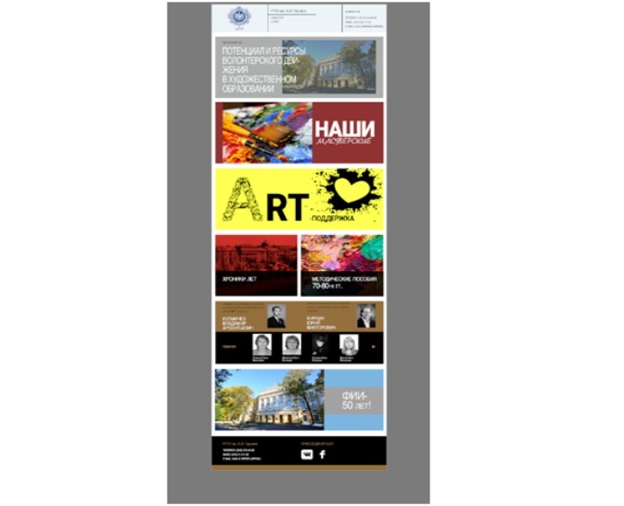 Каждая из рубрик – компонентов музея состоит из тематических обзоров. Например, «ФИИ – педагоги-художники» позволяет раскрыть жизнь и творчество художника ракурсно. Рубрики представлены информационно, визуально, аудио и видео ресурсами.