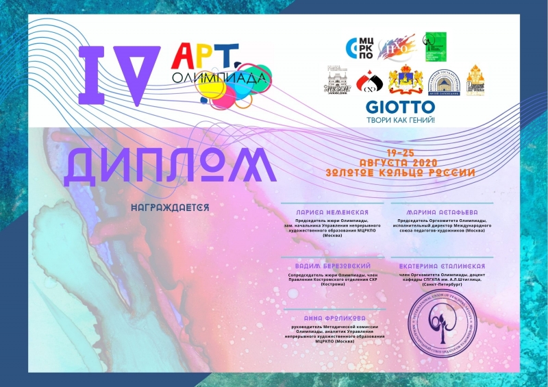 19 – 25 августа на Золотом кольце России состоялась IV Международная АРТ-ОЛИМПИАДА. В этом году в ней приняли участие учащиеся и педагоги школ и студий разных регионов России: Художественная школа "Мастер и Я" (Тверская область, Торжок), ДХС "Перспектива" (Московская область, Краснознаменск), "Детская художественная школа им. С.Д. Эрьзя" (Краснодарский край, Новороссийск), Ступинская детская школа искусств (Московская область, Ступино), МКУДО "Дворец творчества" Талицкая детская школа искусств (Свердловская область, Талица), ГБОУДО ЗДТДиМ (Москва, Зеленоград), МБУ ДО "ДШИ №8 "Радуга" (Самарская область, Самара).