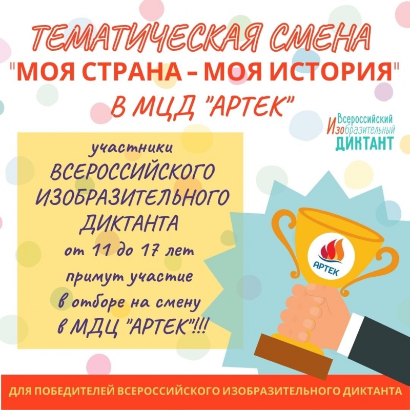 У нас потрясающая новость! Всё участники ВСЕРОССИЙСКОГО ИЗОБРАЗИТЕЛЬНОГО ДИКТАНТА от 11 до 17 лет примут участие в отборе на смену в МДЦ "АРТЕК"!!!! Программа " Моя страна - моя история" Международного союза педагогов-художников стала победителем в конкурсе Министерства просвещения РФ и в 2022 году Союз станет официальным партнёром АРТЕКА! Мы проведём профильную смену для юных художников - победителей специального конкурса! Вот ещё один стимул до 1 декабря принять участие во ВСЕРОССИЙСКОМ ИЗОБРАЗИТЕЛЬНОМ ДИКТАНТЕ))