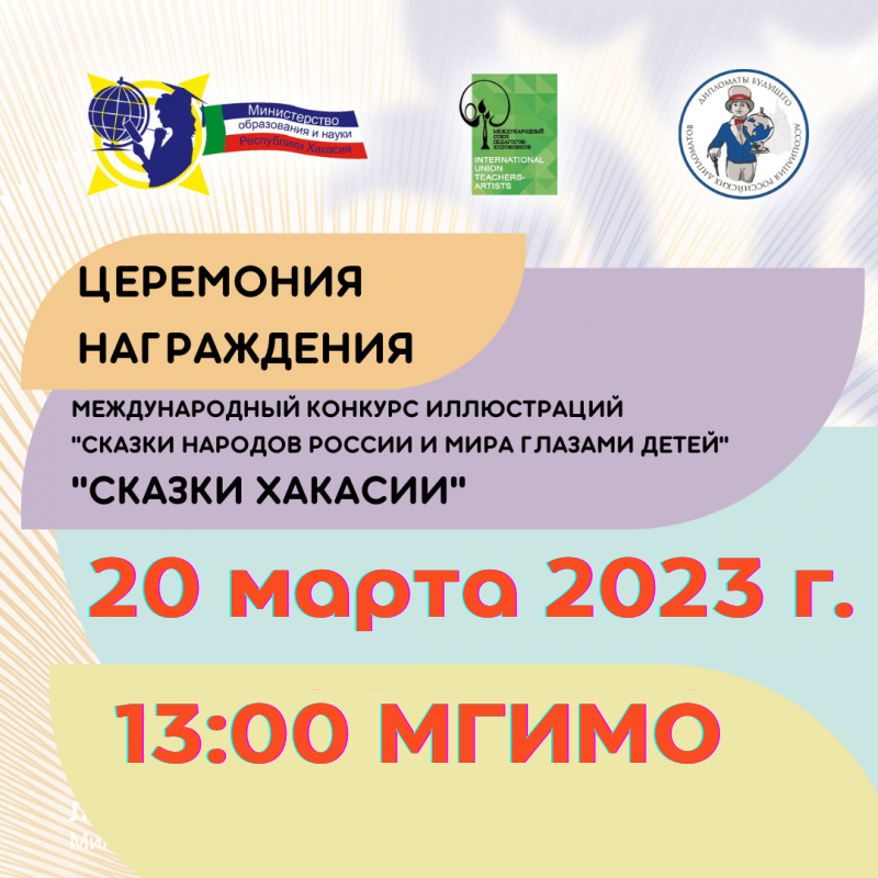 Рады сообщить вам, что с Правительством Республики Хакасия и руководством МГИМО согласовано время и место проведения торжественной церемонии награждения Международного конкурса иллюстраций "Сказки народов России и мира глазами детей" - сказки Хакасии!