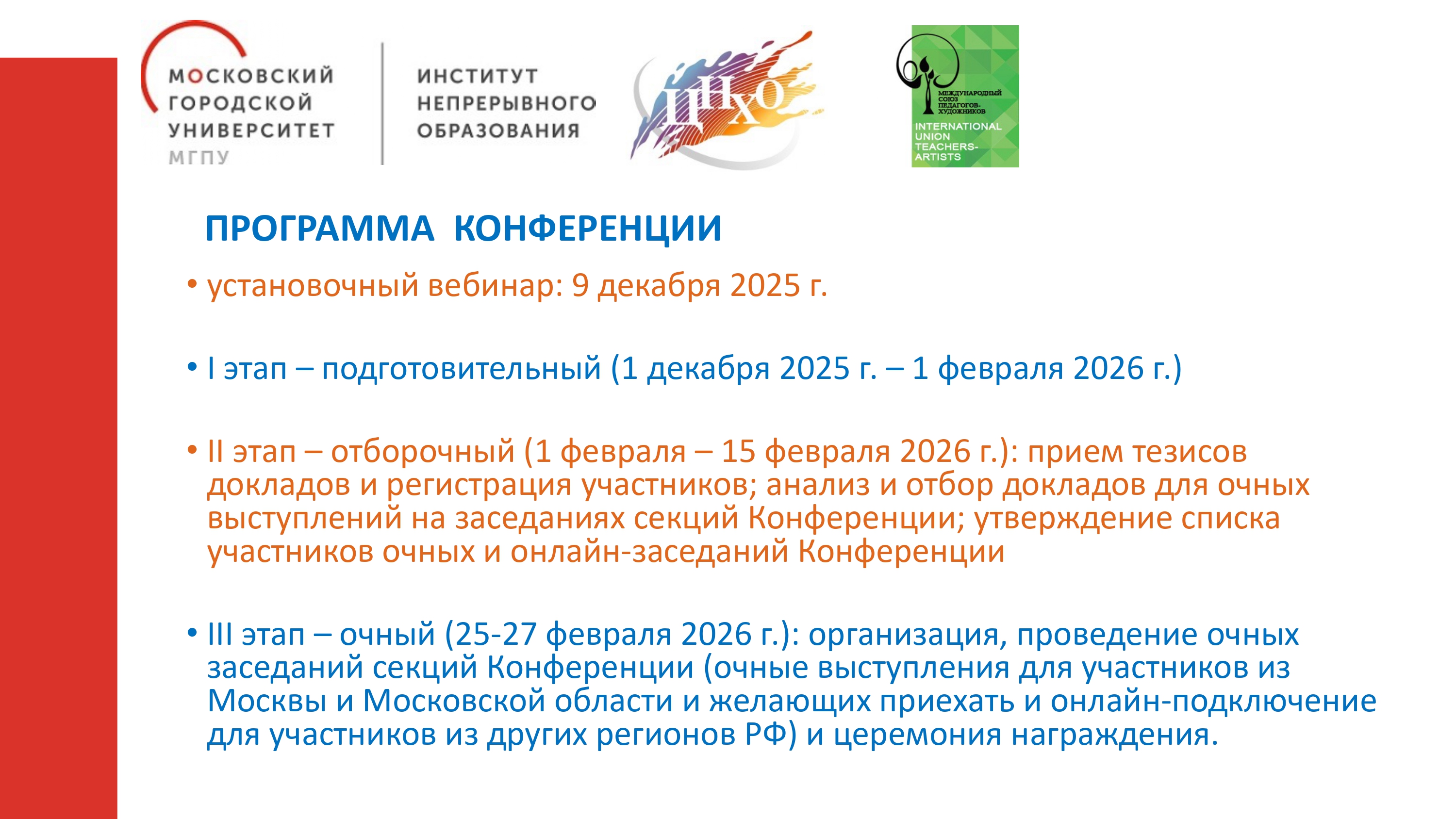 III этап — очный (25-27 февраля 2026 г.): организация, проведение очных заседаний секций Конференции (очные выступления для участников из Москвы и Московской области и онлайн-подключение для участников из других регионов РФ) и церемония награждения.