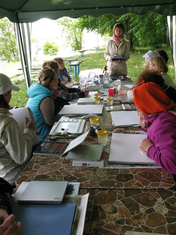 Кулюкина Татьяна рассказала о «Современных графических материалах», водорастворимых акварельных, чернильных мелках и карандашах, познакомила группу педагогов-художников с новинками Английской фирмы «DERWENT», которые будут доступны широкому кругу художников уже этой осенью. Новые графические материалы очень понравились своими свойствами, выразительными эффектами, удобством в техническом отношении, простотой в использовании. Подобный материал отлично подходит как для длительной кропотливой работы в мастерской, так и для пленэра в походных условиях.