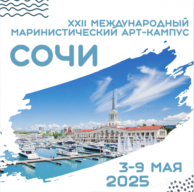 12 января 2025 - XXII МЕЖДУНАРОДНЫЙ АРТ-КАМПУС НА ЧЁРНОМ МОРЕ Международный очный маринистический конкурс-пленэр 3-9 мая 2025 г. СКАЧАТЬ ПОЛОЖЕНИЕ Для оформления вашей заявки нужно пройти регистрацию по предложенной форме: https://forms.gle/zbMRhxRNTVZ4S3BPA Наш традиционный АРТ-КАМПУС на майских праздниках мы проведём в Сочи, курортной столице России! В этом году наш АРТ-КАМПУС будет размещаться в самом це...